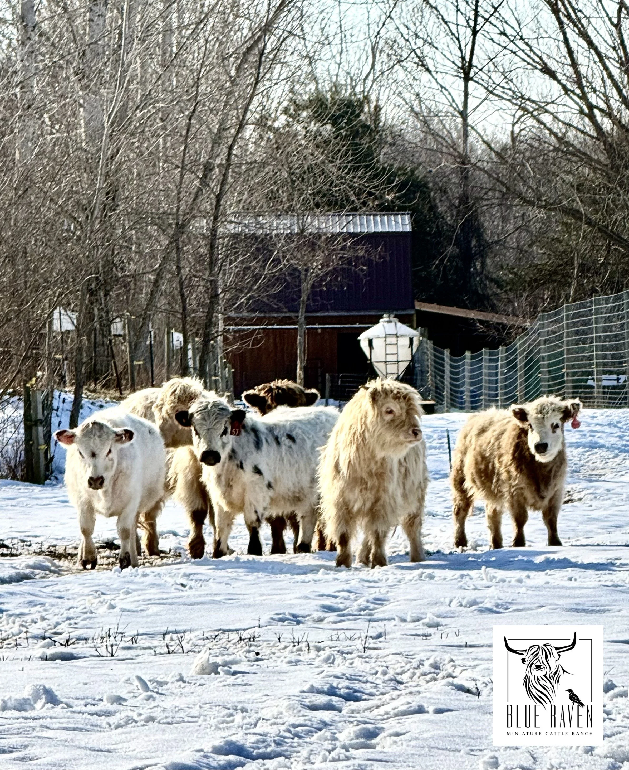 Due to their miniature status, these cattle tend to do less damage to land and fencing since they weigh less and have smaller hooves. They also, tend to consume much less than traditional breeds. They are also efficient grazers, thriving on grass and requiring less supplemental feed. These little loves require small acreage, anywhere between 1/2 to 1 acre of pasture of land per animal for optimal grazing, and ample quality hay to sustain through heavy winter months. Miniature Highlands are a hardy breed that can withstand harsh cold temperatures in winter and are adaptable to the hot temperatures in the summer. During Summer season they require adequate shade and water to keep cool and refreshed. In addition to grazing land, miniature cattle need space for a shelter or barn for protection from natural elements. As these are herd animals, we recommend for pairs, 1 to 2 acres.